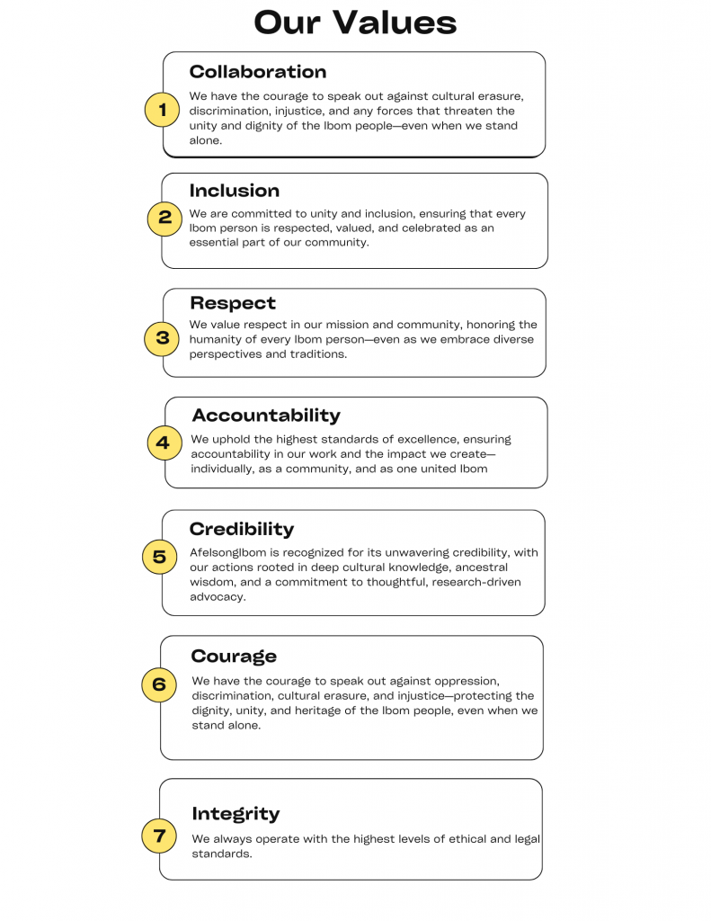 Our values are the foundation of AfeIsongIbom, shaping both our internal culture and the way we uplift our people and communities. Rooted in the rich traditions of the Ibom people, our founders established AfeIsongIbom with a deep commitment to unity, heritage, and justice. We honor their legacy by advocating for cultural preservation, standing against discrimination, and uplifting Ibom voices. With a spirit of resilience and solidarity, we continue to champion the dignity, progress, and prosperity of the Ibom people—at home and across the world.